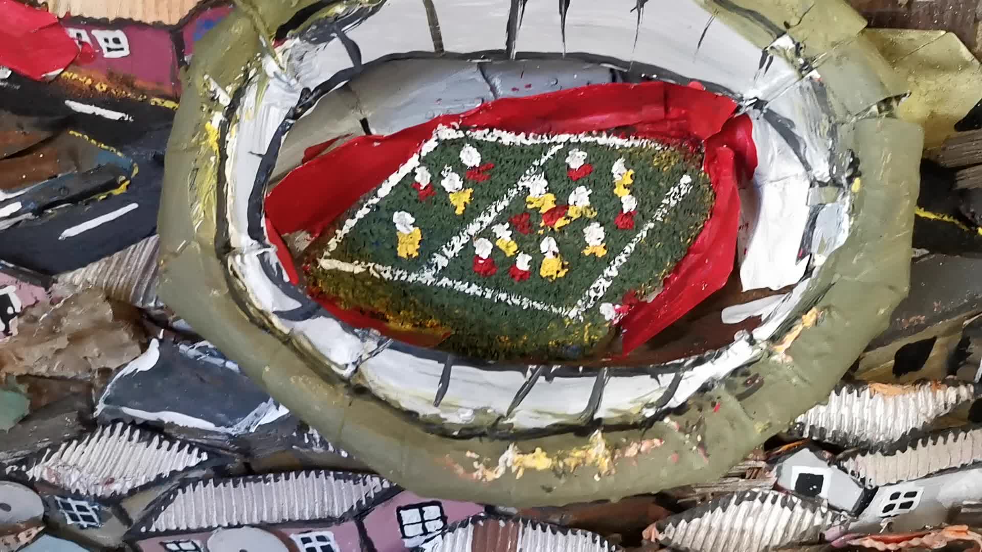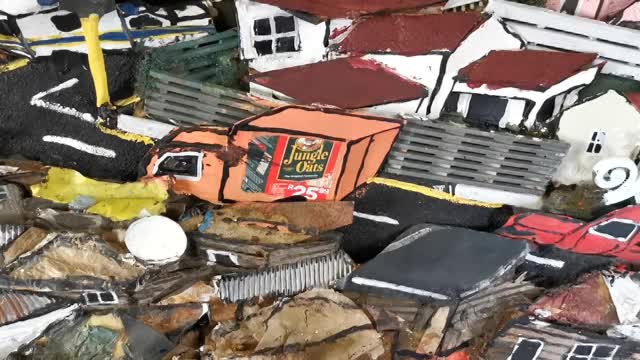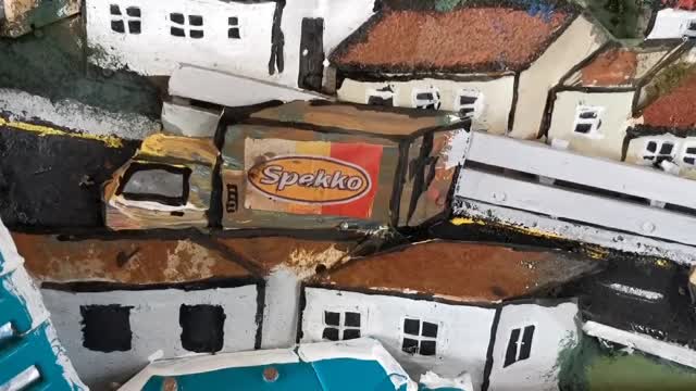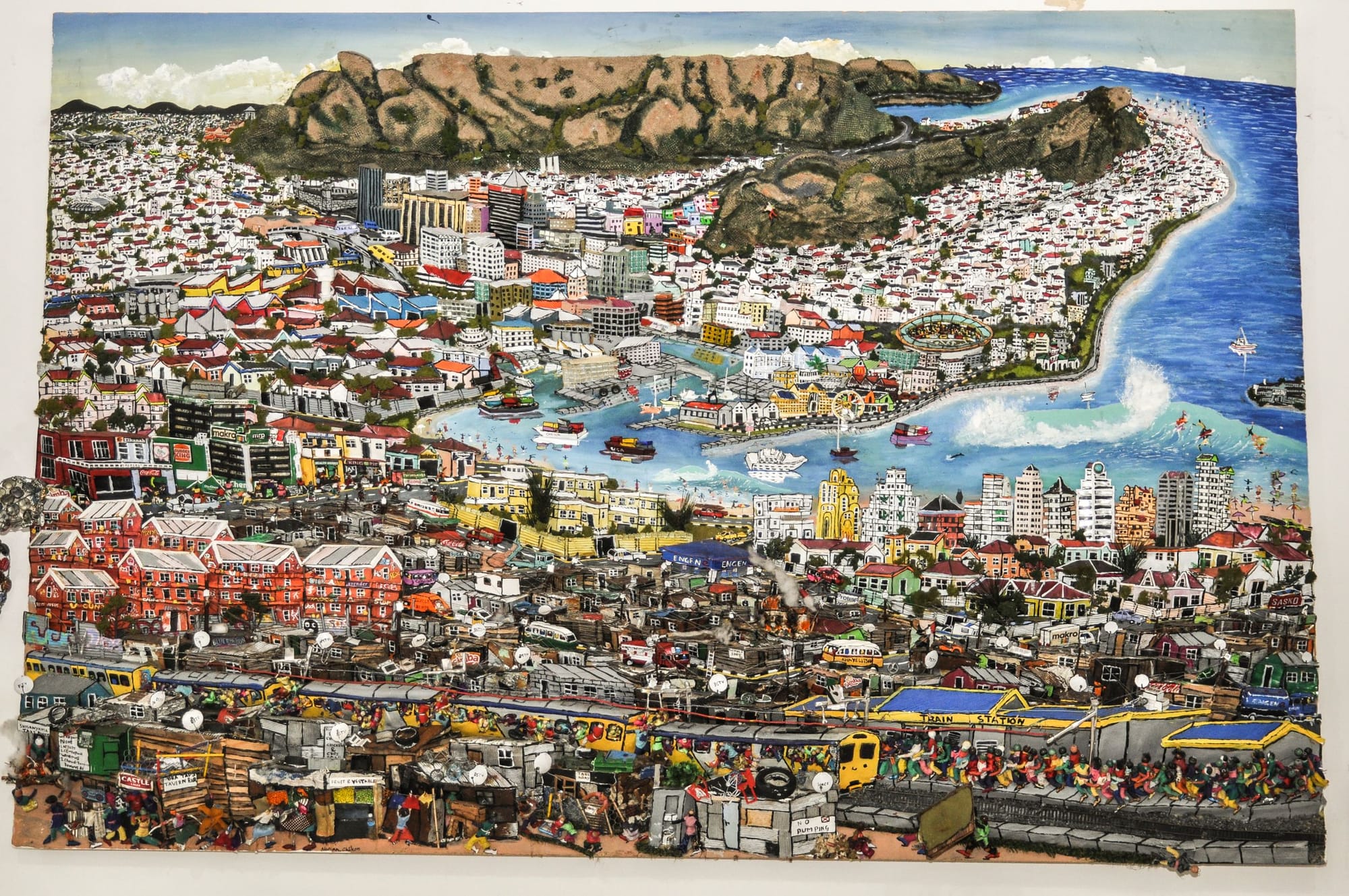 Size 120 cms * 120 cms - BXL-004 Unique Painting showcasing the allure of Hout Bay in Cape Town,South Africa.A mixed media artwork made with recyclable materials such as aluminium, wood, fabrics , cardboads and anything that can be found !